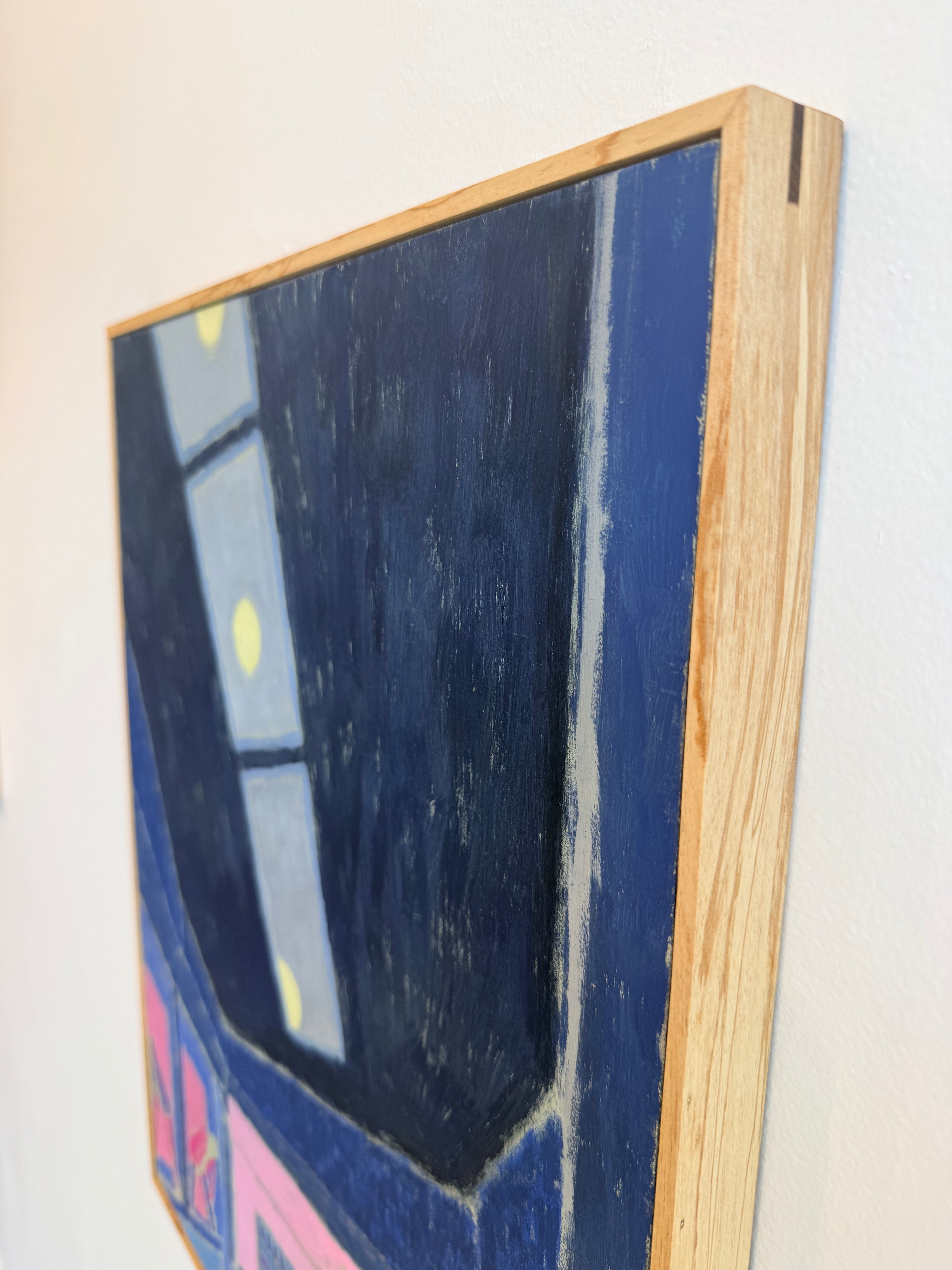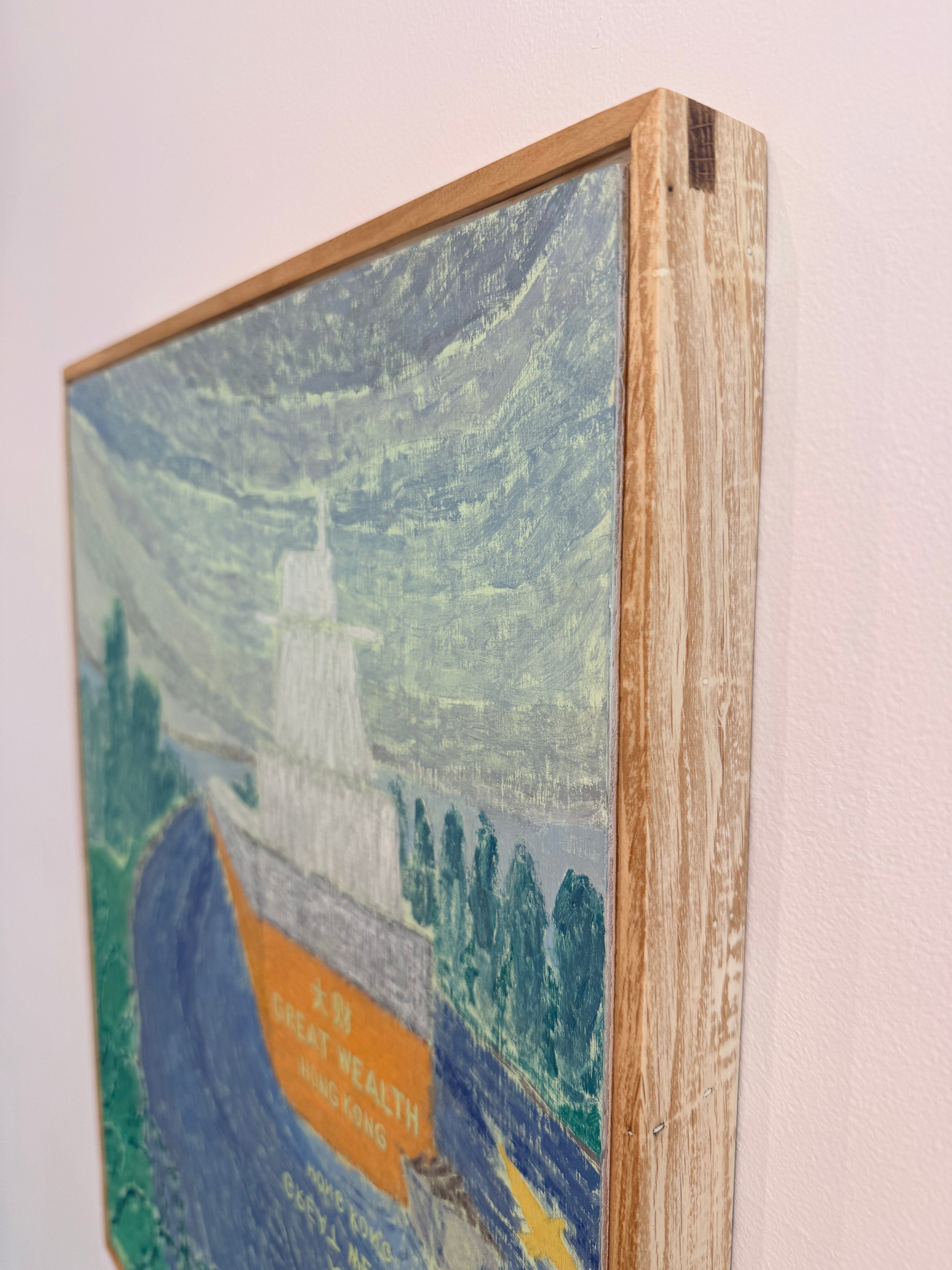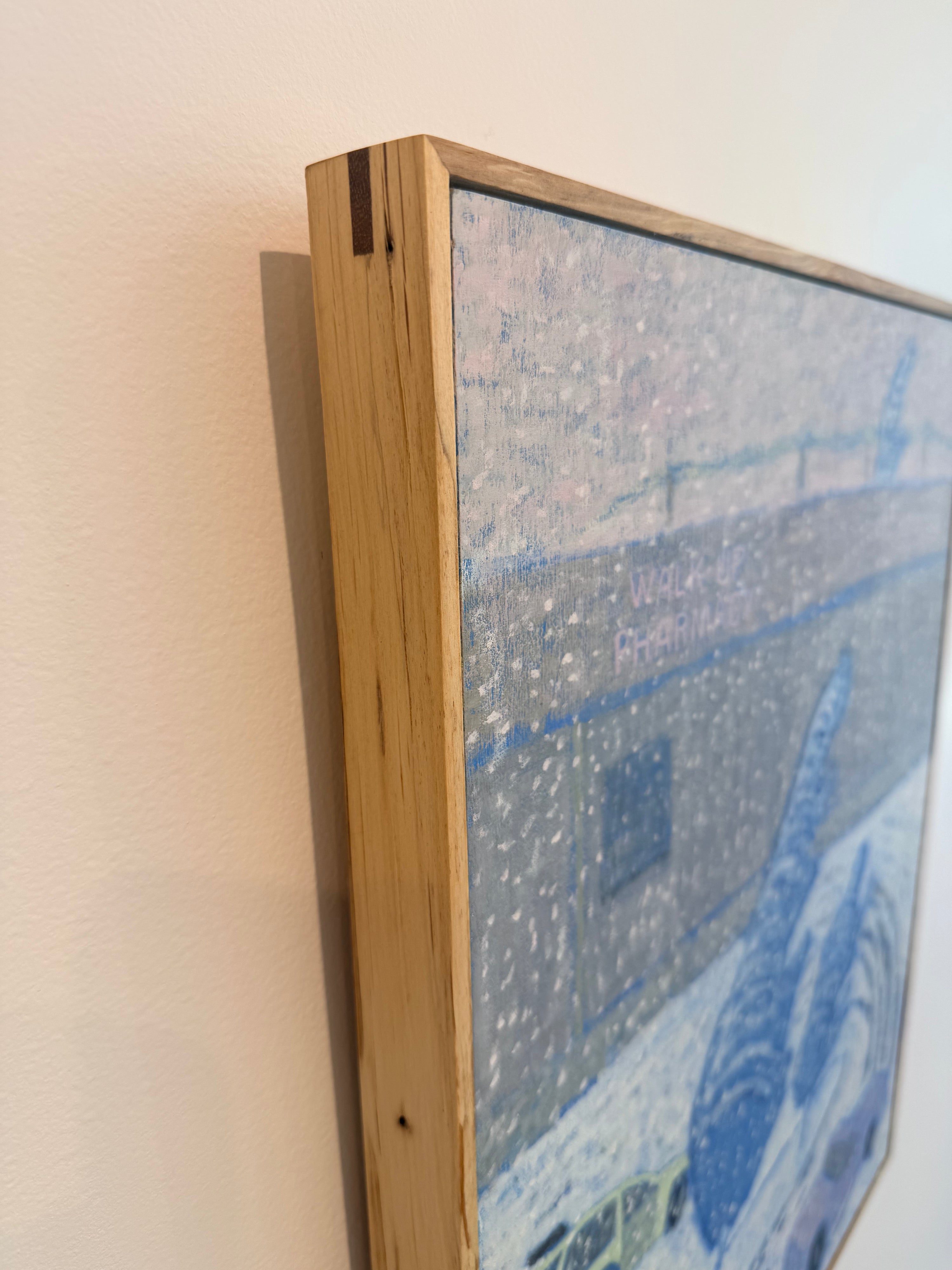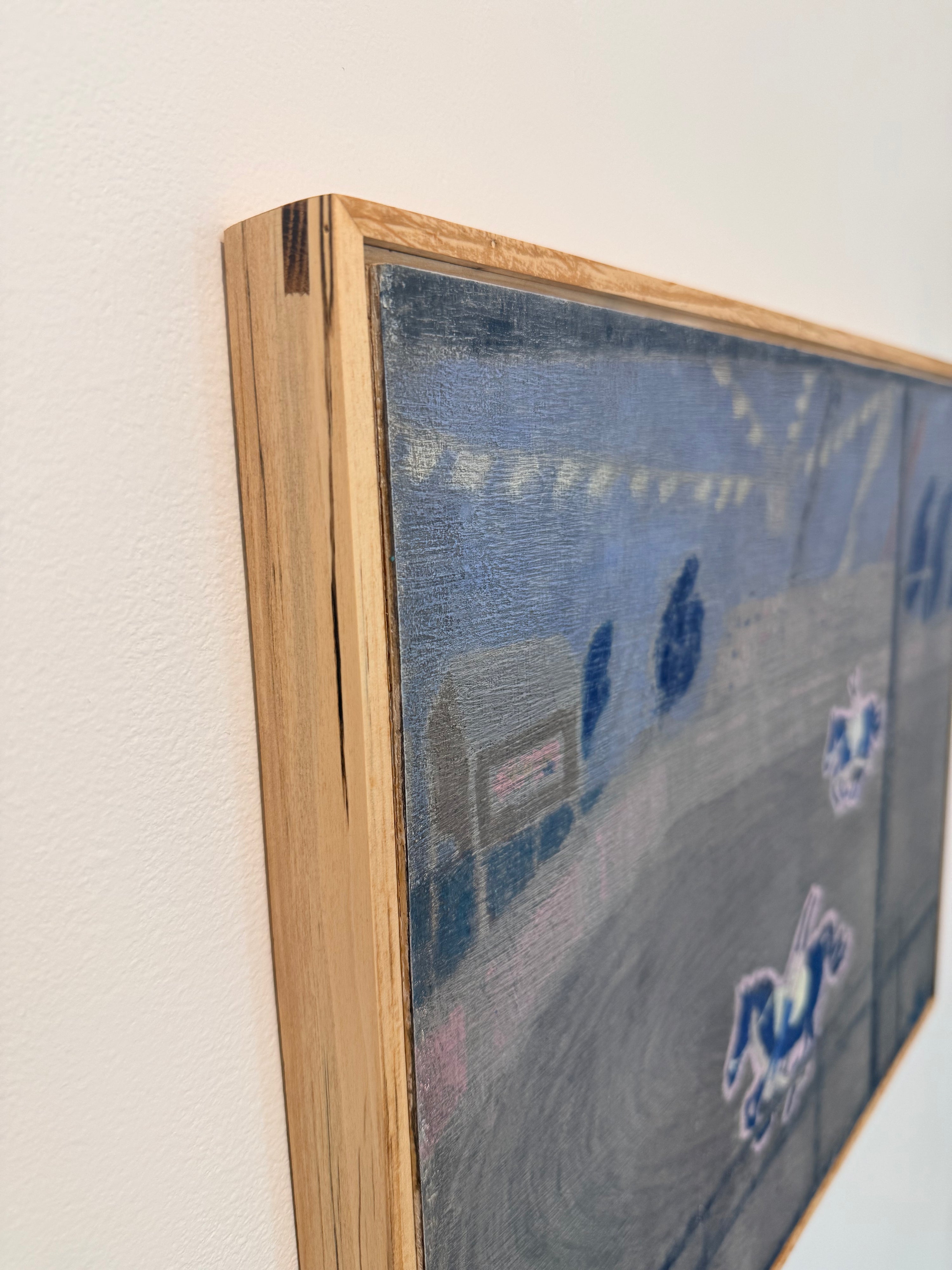 He returns to these scenes repeatedly, both in person and in memory, redrawing and refining them over time. Through this process, compositions shift and simplify, distilling each image to its most essential forms, colors, and symbols. What begins as observation gradually becomes something more reflective and interior. The resulting works move beyond documentation, becoming meditations on memory, time, and place.